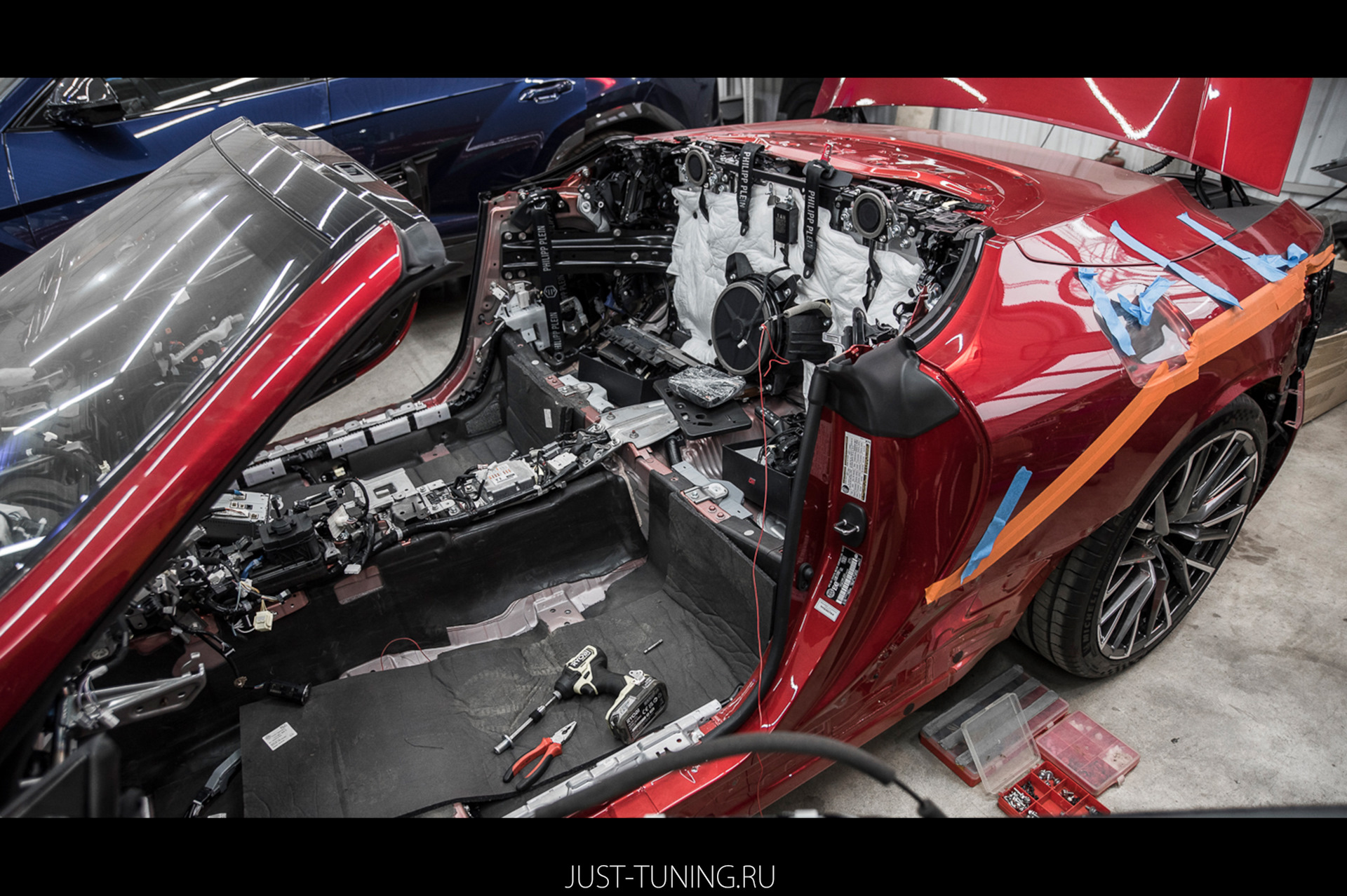 * Окрас: Задача усложнялась тем, что автомобиль с завода окрашен в Candy цвет, требующий особого подхода. Кроме того, на расширителях арок присутствуют карбоновые элементы, которые нужно было аккуратно перелачить, сохранив границы между карбоном и краской.